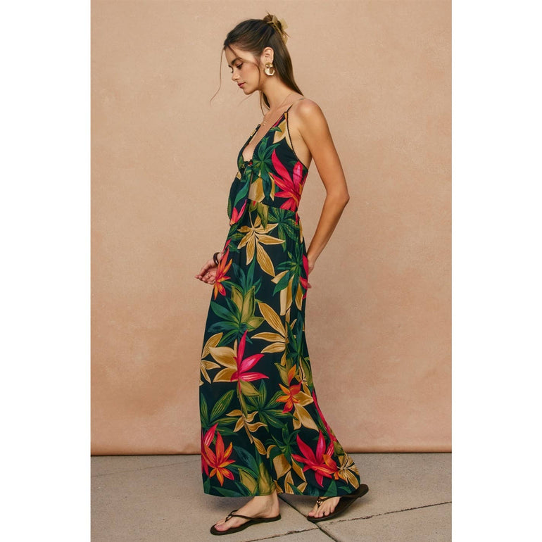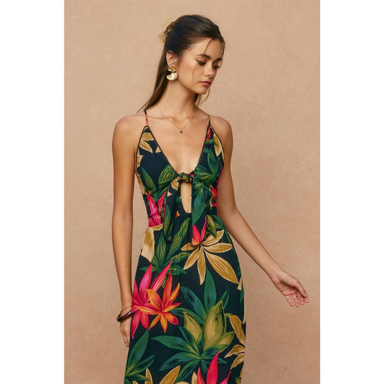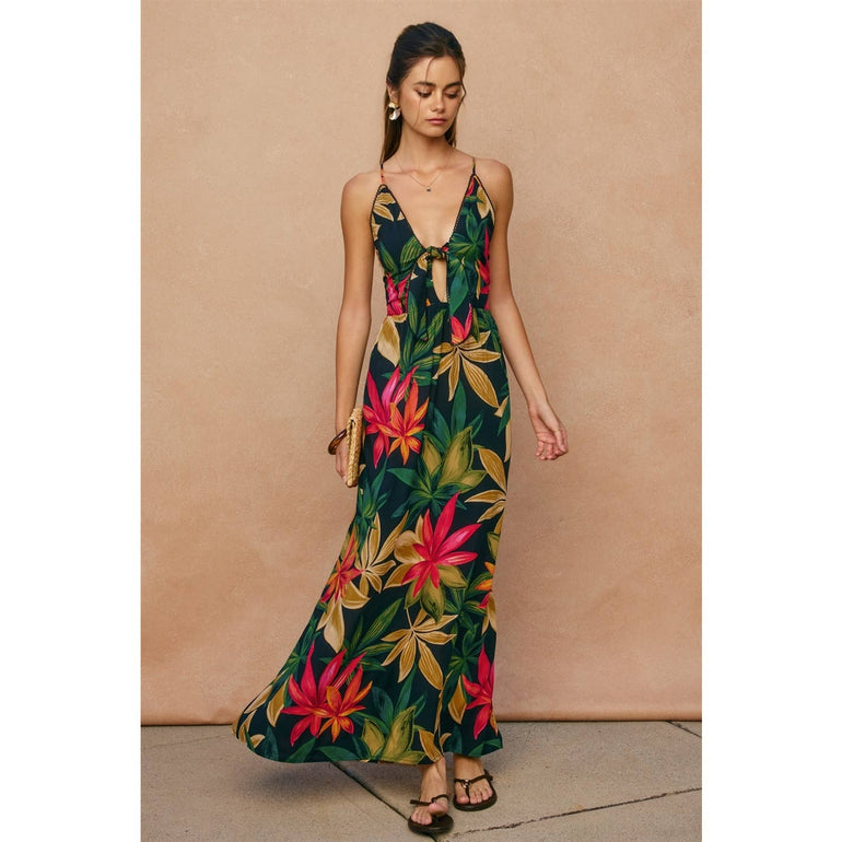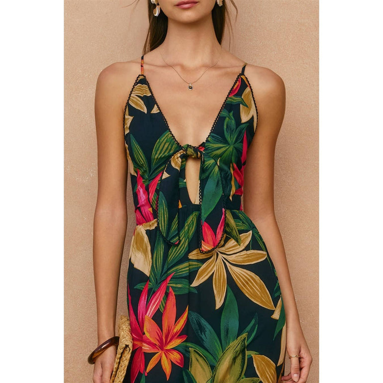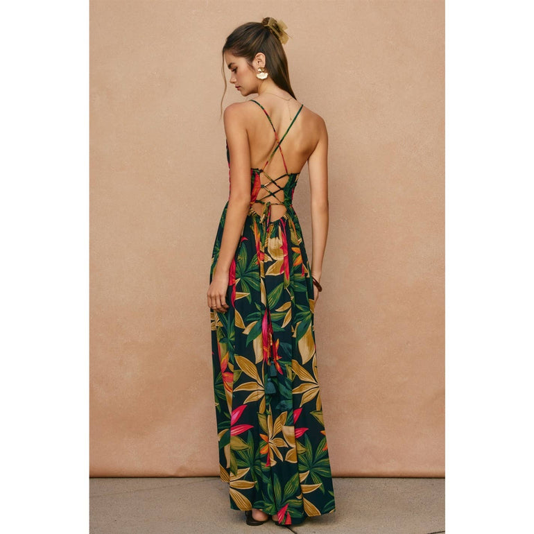 Tropical print maxi dress. Model is 5'9" and wearing size Small. - Back lace-up tie closure - Plunging neckline with front tie detail - Scalloped lace trim - Side pockets - Unlined Shell: 100% Rayon Lining: None