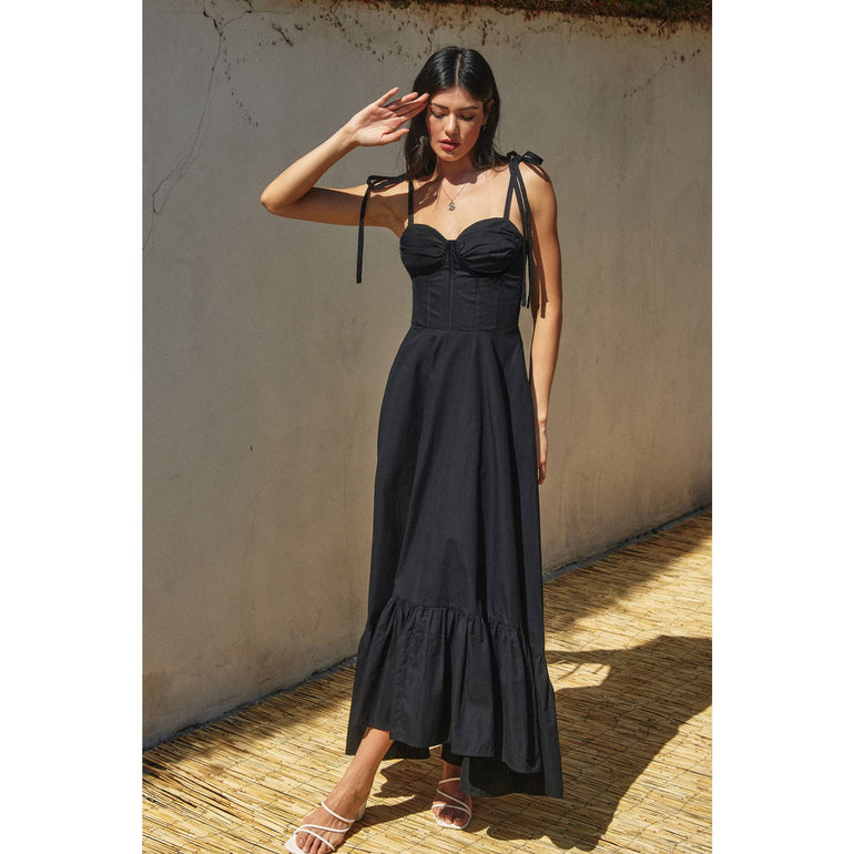 Cotton poplin maxi dress. Model is 5'8" and wearing size Small. - Ruched cups - Corset structured bodice: padded cups, underwire, and boning - Ruffled hem - Adjustable tie shoulder straps - Smocked back panel - Hidden side zipper closure - Lined on the bodice for BLACK and fully lined for WHITE Shell: 100% Cotton Lining: 100% Cotton