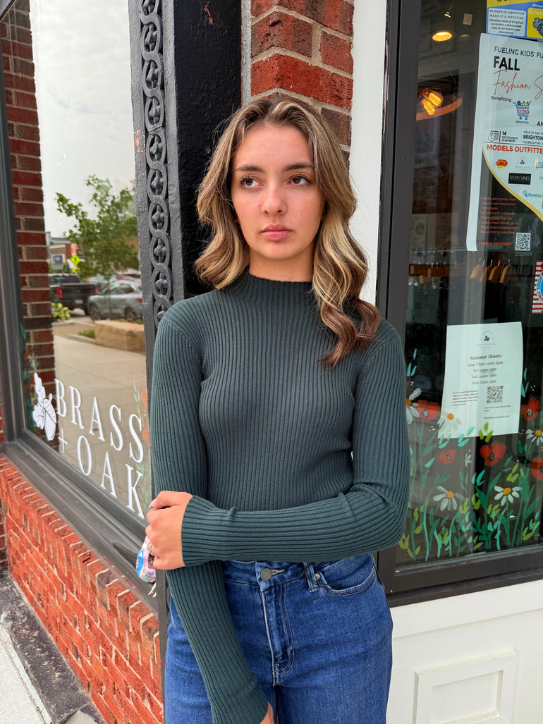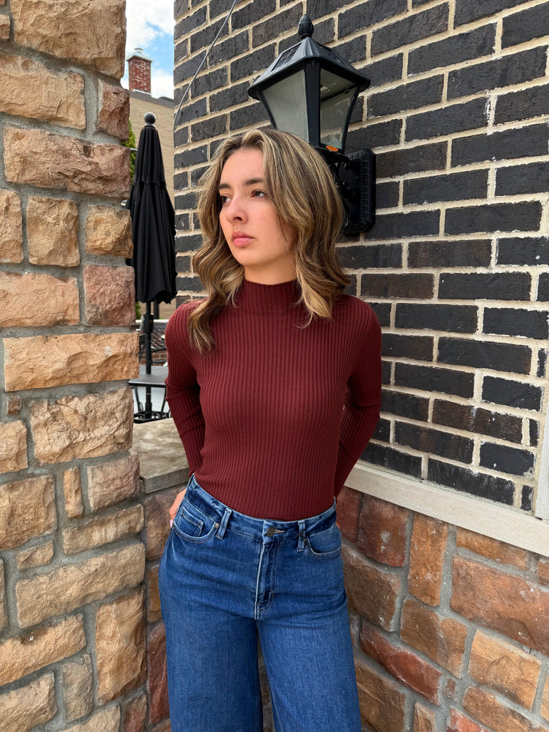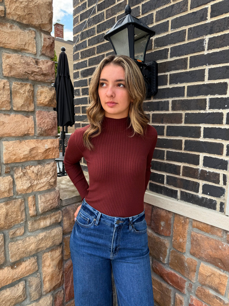 Medium weight knitted sweater with a fitted silhouette, a mock neck, and long sleeves. Shell: 50% Rayon, 28% Polyester, 22% Nylon Lining: N/A