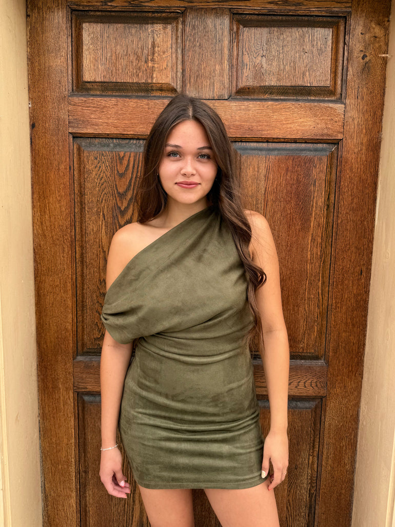 SUEDE ASHMETRIC SHOULDER MINI DRESS
