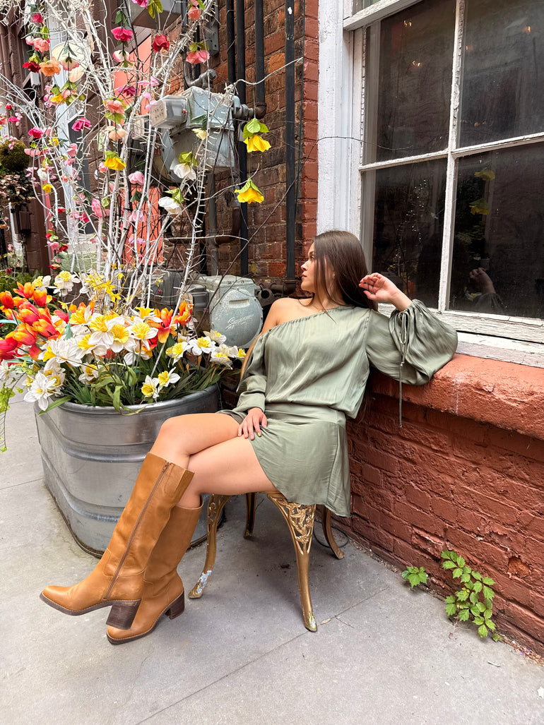 Woven Polyester Satin Off The Shoulder Long Sleeve Mini Dress With Shoulder And Sleeve Tie Strap Side Slit And Zipper Detail