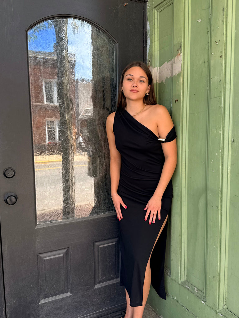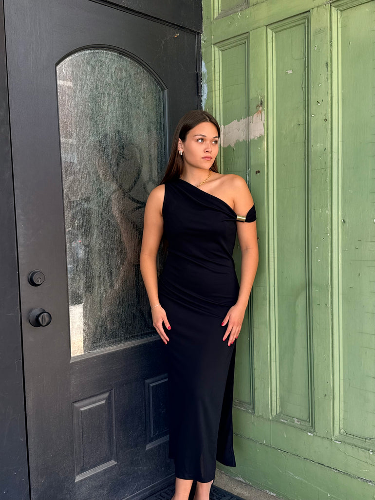One shoulder short sleeve maxi dress with side slit detail. Model is 5'6" and wearing size Small. - One shoulder - Trim detail - Shirring detail - Side slit - Unlined Shell: 100% Polyester Lining