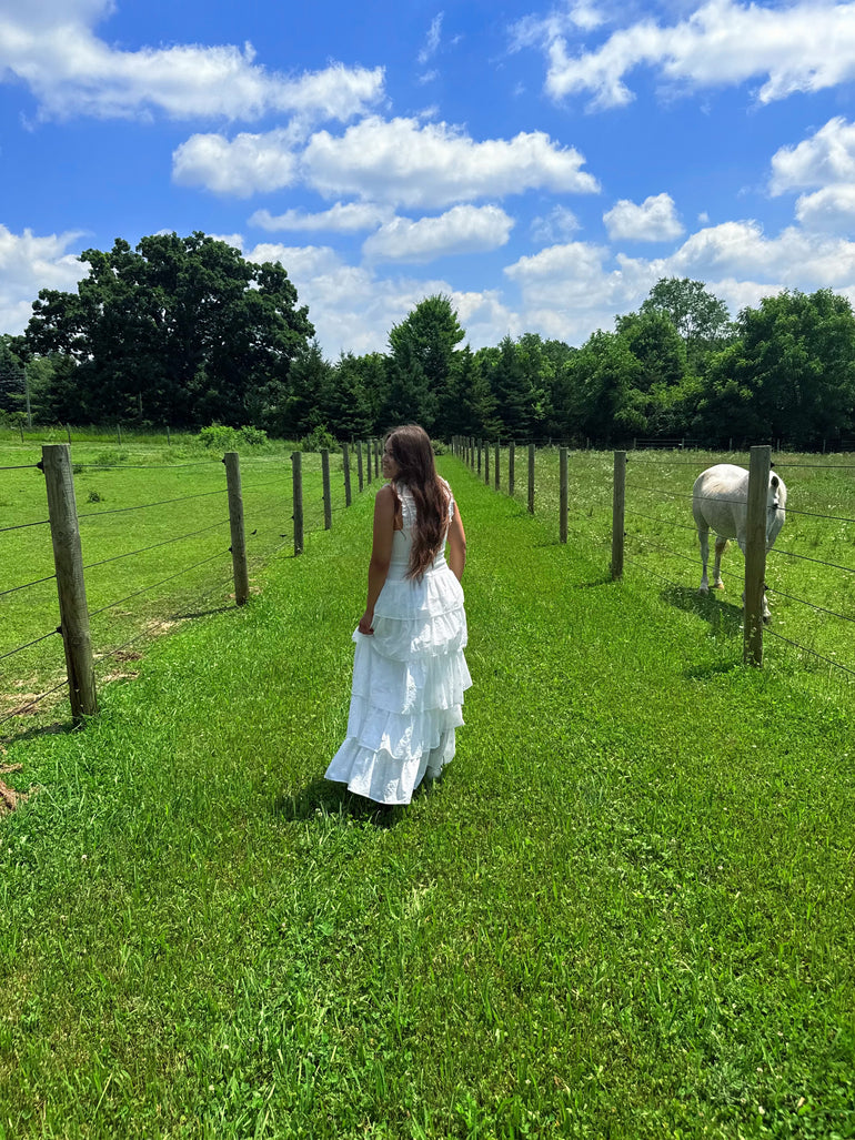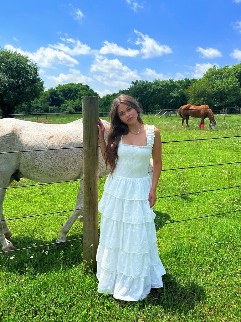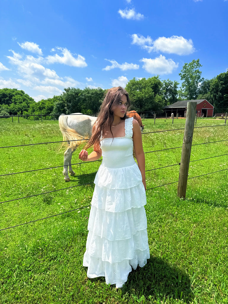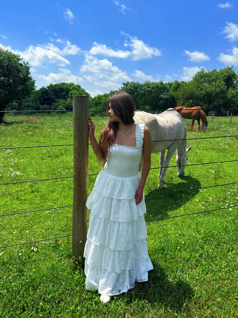 FLORAL EYELET RUFFLE STRAP SMOCKED TIERED MAXI
