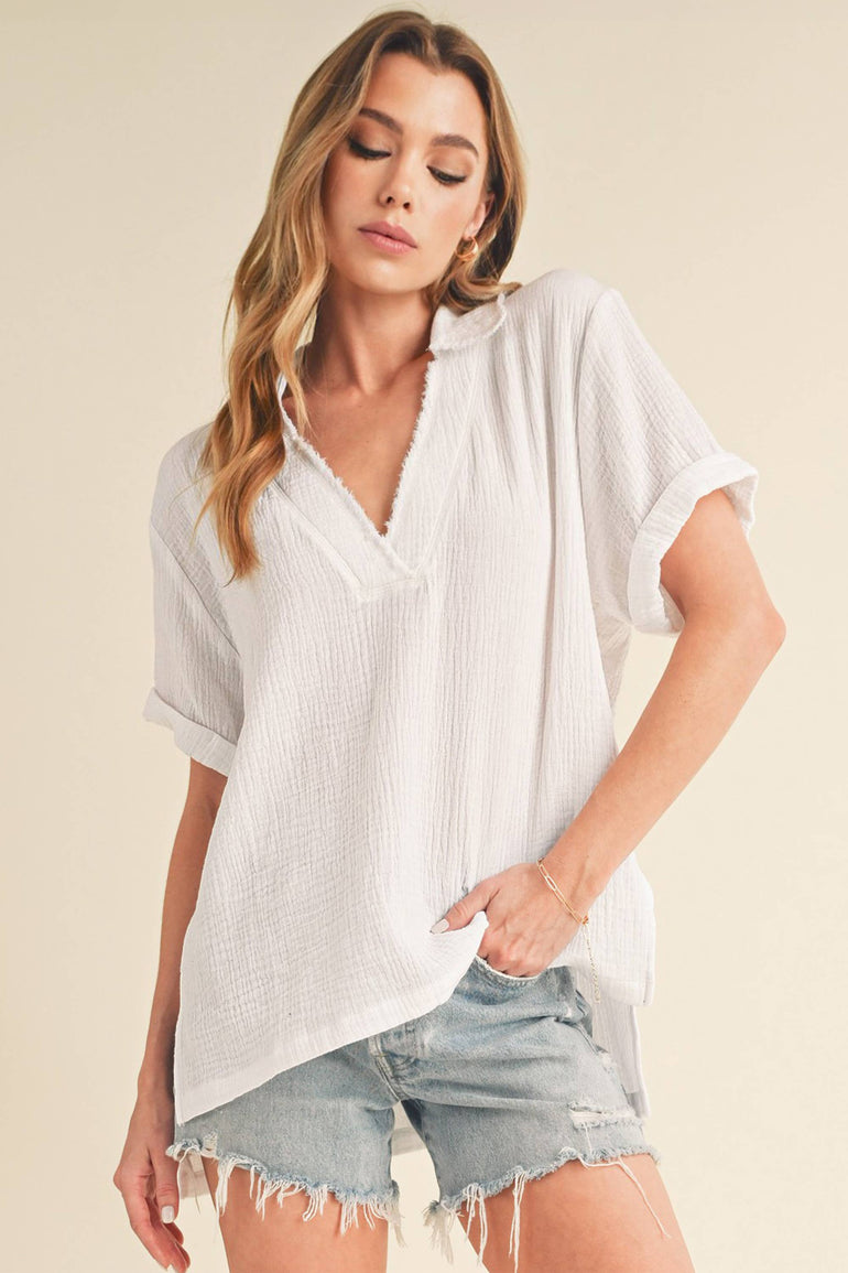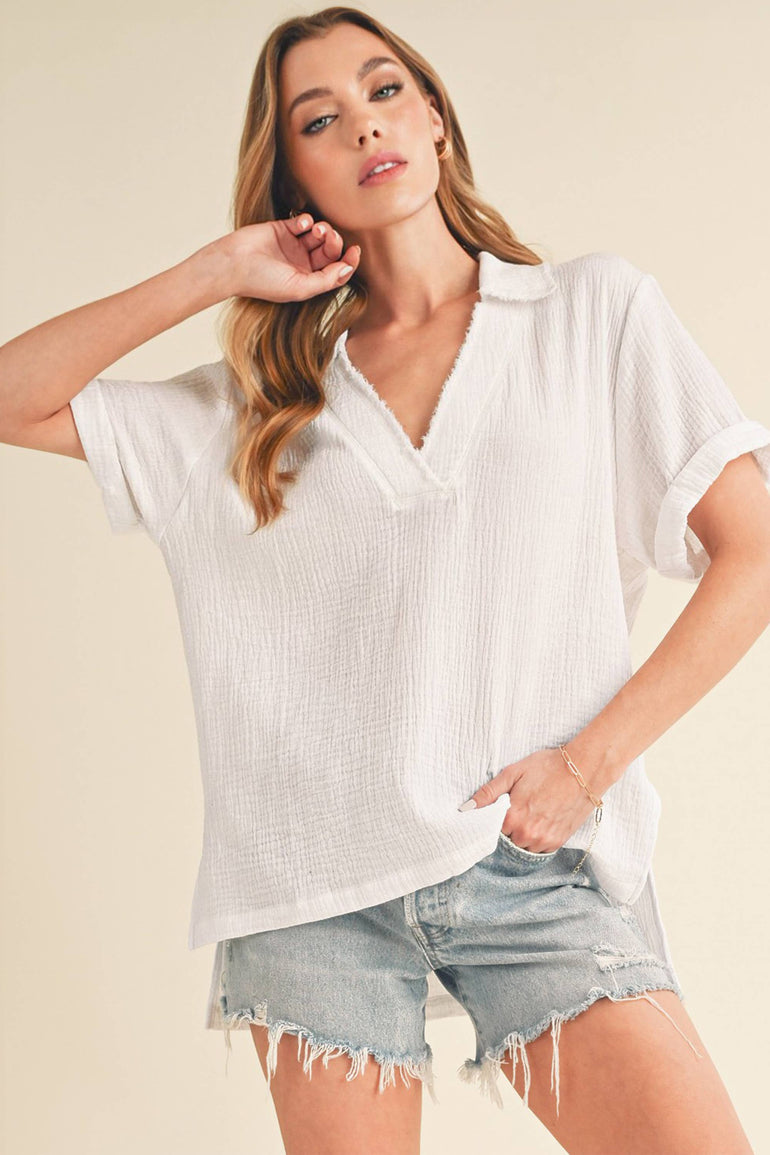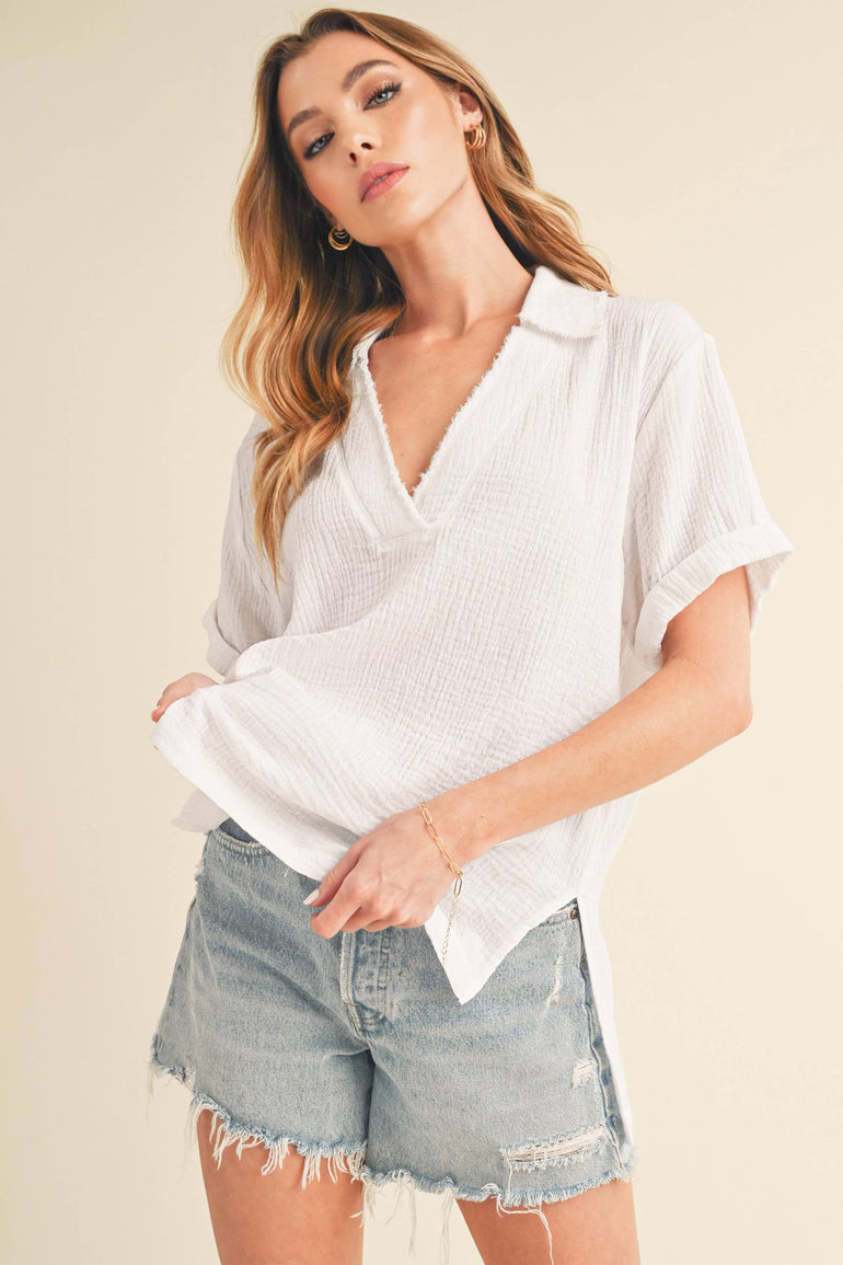 Step into spring with Jamy Collared Short Sleeve Top. Crafted from cotton gauze, it features a dreamy collared v-neckline, side slits, and chic raw edge detailing for a seriously comfortable and stylish look.
