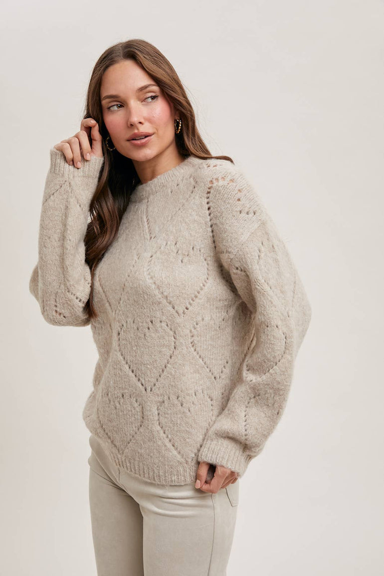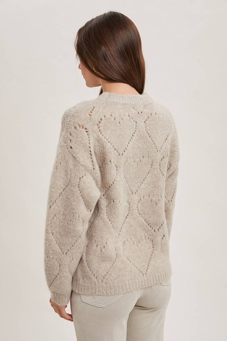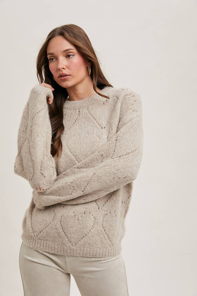 The crew neck heart knit sweater is a cozy and charming piece, perfect for adding a playful touch to your outfit. This sweater features a classic crew neckline and is adorned with heart-shaped knit patterns, giving it a whimsical and sweet vibe. Made from soft, comfortable knit fabric, it's ideal for cooler days, providing both warmth and style. The heart motif adds a fun and trendy element, making it a versatile choice for casual wear. Pair it with jeans or skirts for a cozy yet stylish look.