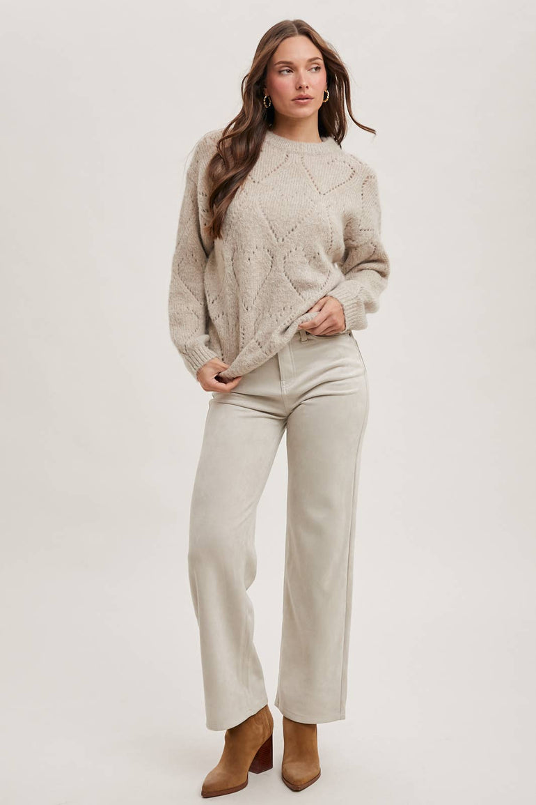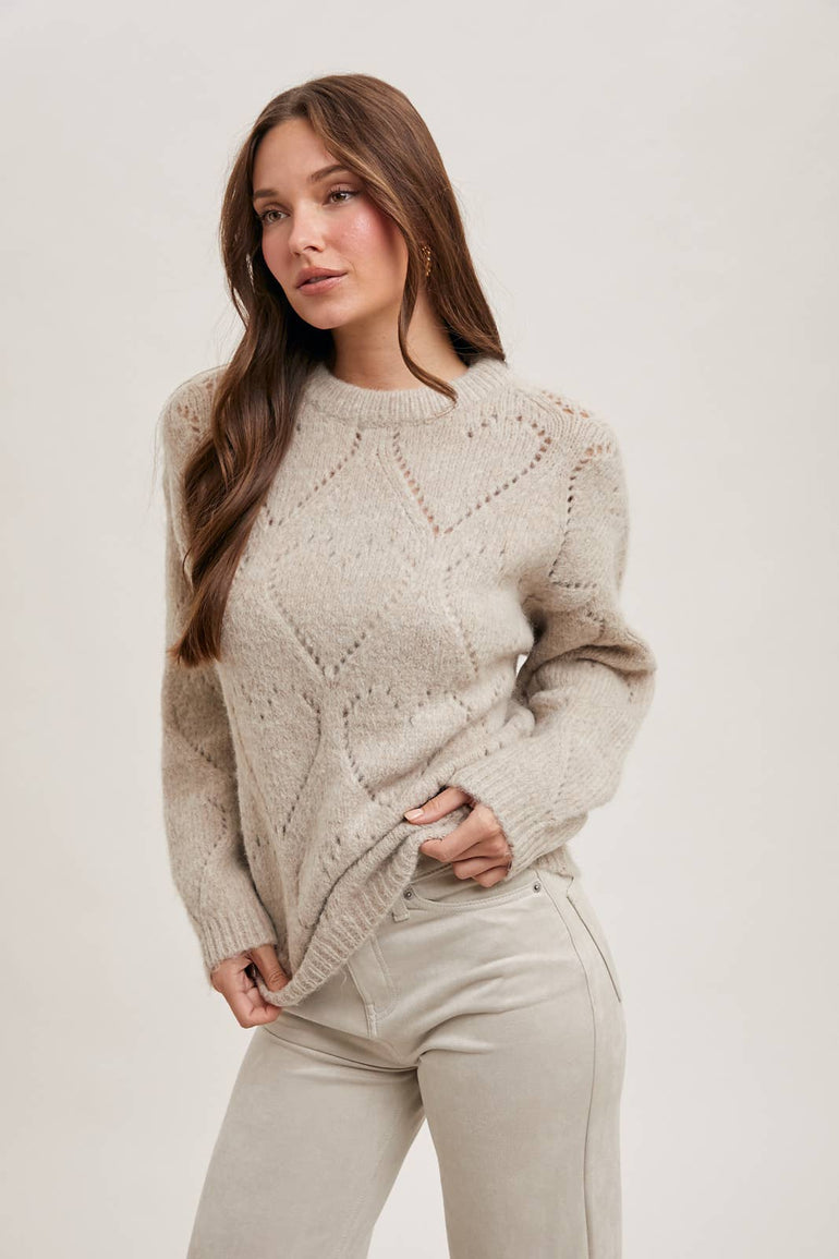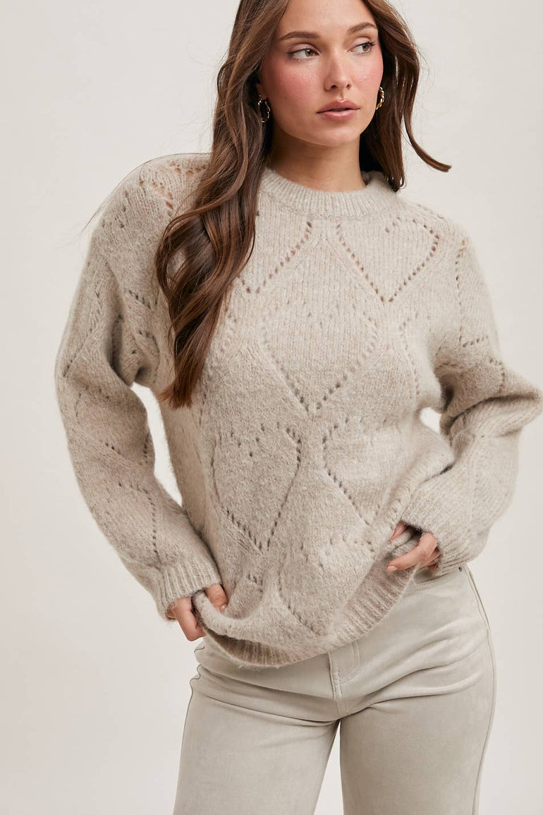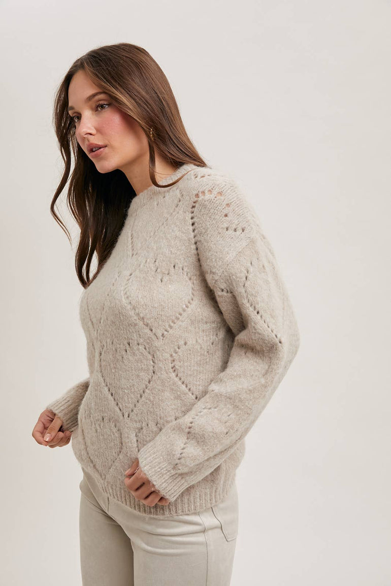 The crew neck heart knit sweater is a cozy and charming piece, perfect for adding a playful touch to your outfit. This sweater features a classic crew neckline and is adorned with heart-shaped knit patterns, giving it a whimsical and sweet vibe. Made from soft, comfortable knit fabric, it's ideal for cooler days, providing both warmth and style. The heart motif adds a fun and trendy element, making it a versatile choice for casual wear. Pair it with jeans or skirts for a cozy yet stylish look.