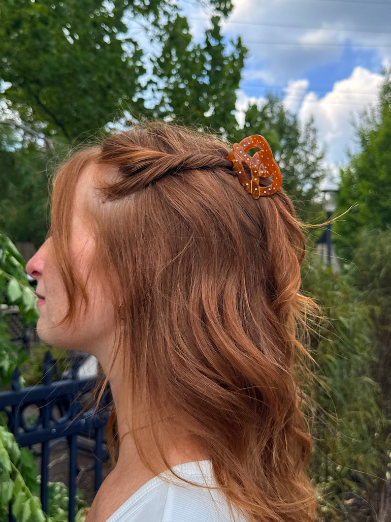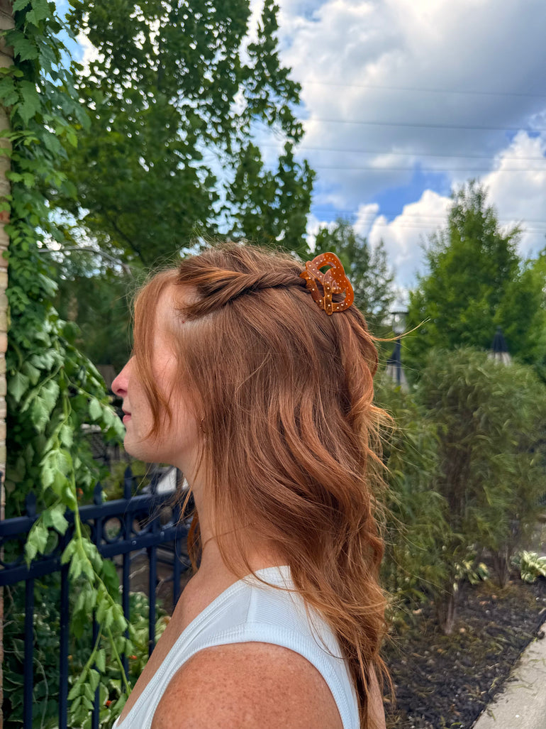 Meet the Mini Pretzel Claw Clip β€” a new, compact version of our beloved original Pretzel design. Hand-painted by our Solar Eclipse artists and crafted in small batches, this mini clip brings the same signature style in a downsized silhouette, perfect for half-up looks, finer hair, or adding a subtle statement to your everyday routine. Designed in New York City, this clip is double-sided for a flawless look from every angle. Handmade with our signature biodegradable cellulose acetate (made from recycled wood pulp), it’s lightweight yet strong β€” and made to last. Key Features Mini Version of Our Signature Pretzel A smaller take on our original best-selling claw clip. Original Art Copyrighted design, hand-painted by our in-house Solar Eclipse artists. Eco-Friendly Materials Made from biodegradable cellulose acetate derived from recycled wood pulp. Extra Strong Hinge Durable, secure, and made for all-day wear. Sustainable Packaging 100% recyclable and plastic-free.