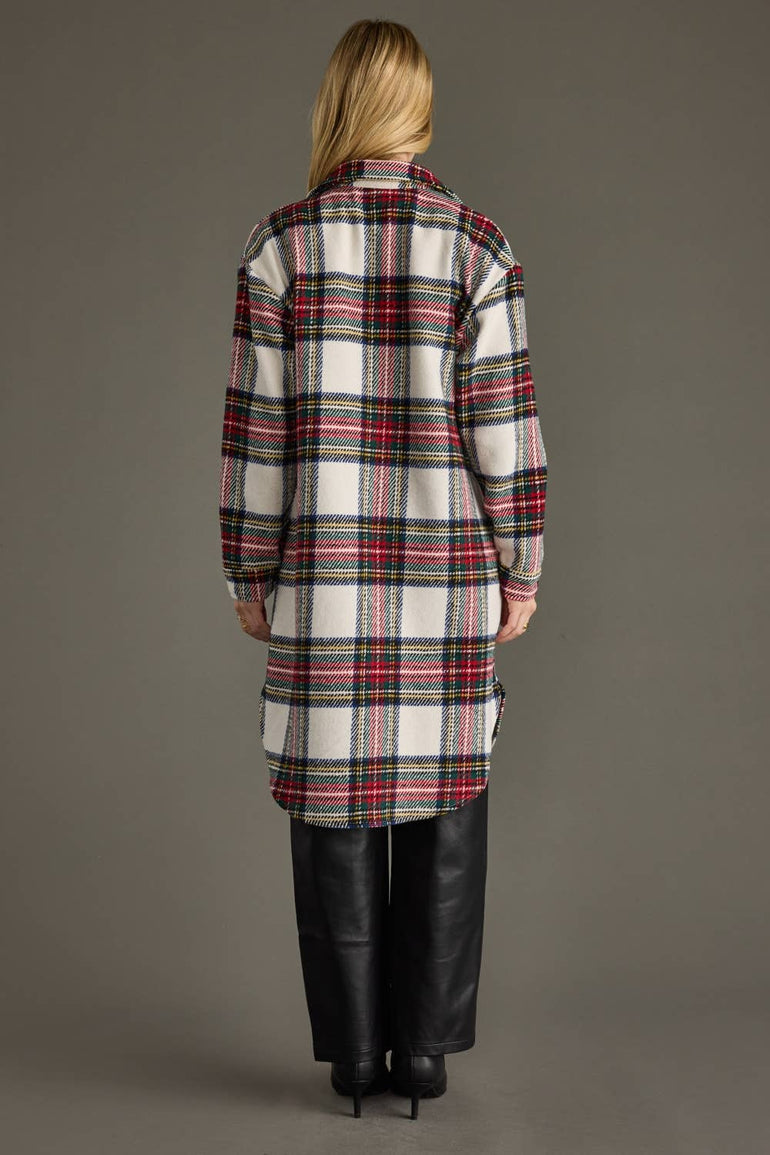 Ivory & multicolored plaid long shacket Button closure Two side pockets