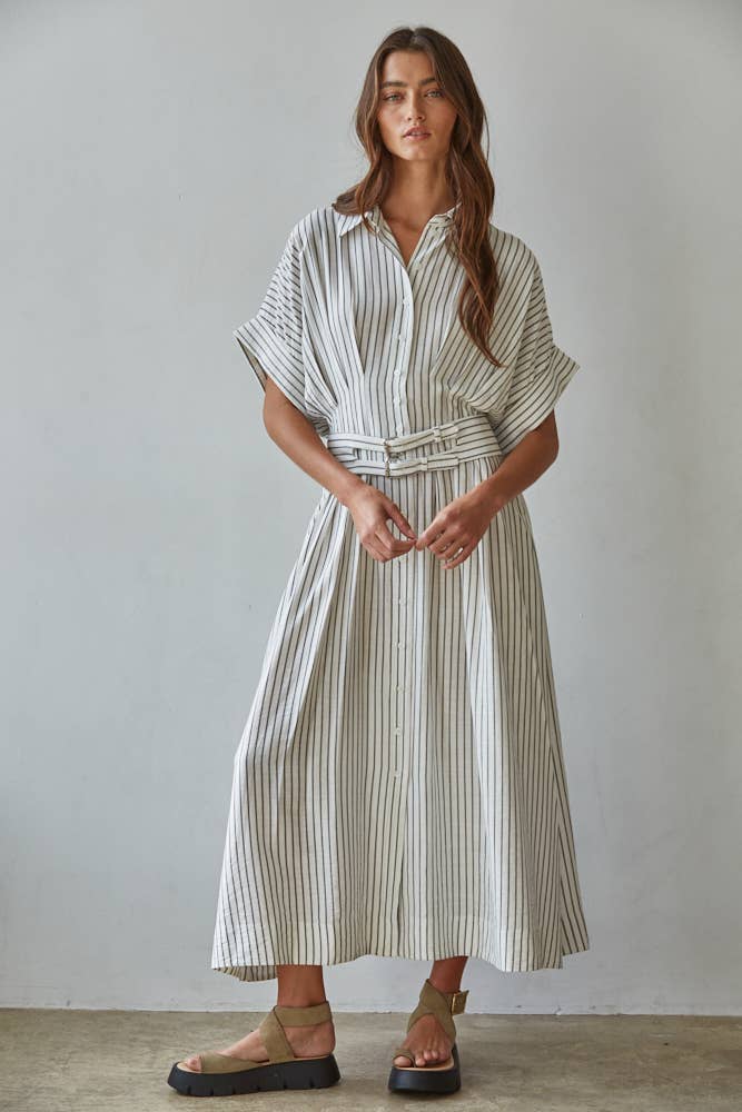 Woven Rayon Polyester Striped Short Sleeve Collared Button Down Flare Midi Dress with Belt Detail