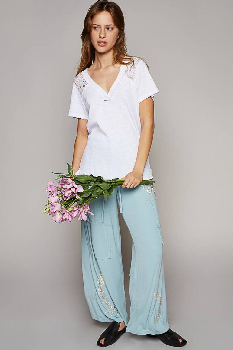 Designed V-neck, short sleeve, relaxed fit top in rib and lace mix with raw edge detail pointed solid pattern.