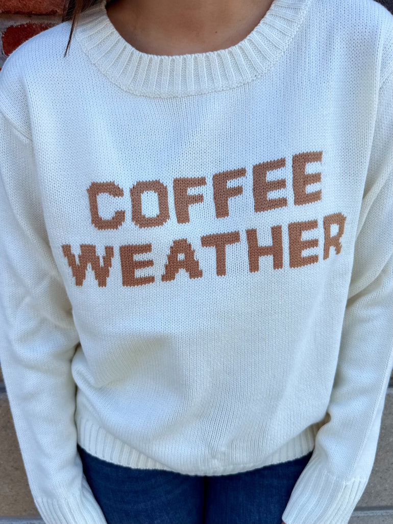 Ivory knit sweater Brown "Coffee Weather" text on the front 100% Acrylic