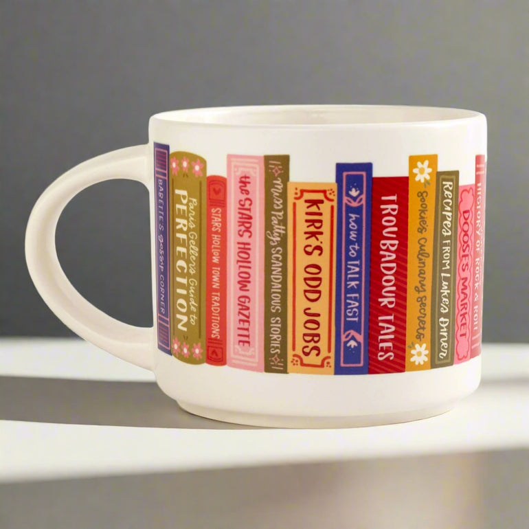 Step into Stars Hollow every time you sip from this Gilmore Girls-inspired bookshelf mug! Wrapped in hand-illustrated book spines, featuring titles like Paris Geller’s Guide to Perfection, Kirk’s Odd Jobs, and The Stars Hollow Gazette, this oversized ceramic mug is perfect for your morning coffee, cozy tea, or a giant cup of cocoa. With a sturdy handle and generous capacity, it’s designed for long reading sessions, rewatching your favorite episodes, or simply daydreaming about life in a small town filled with quirky characters. Perfect for Gilmore Girls lovers, bookworms, and anyone who can’t resist a charming bookshelf moment! Material: Ceramic Mug Color: Cream Holds: 14 oz Care: Microwave safe and hand wash recommended