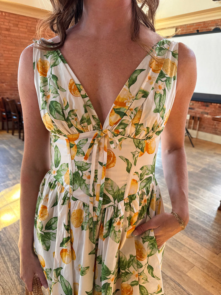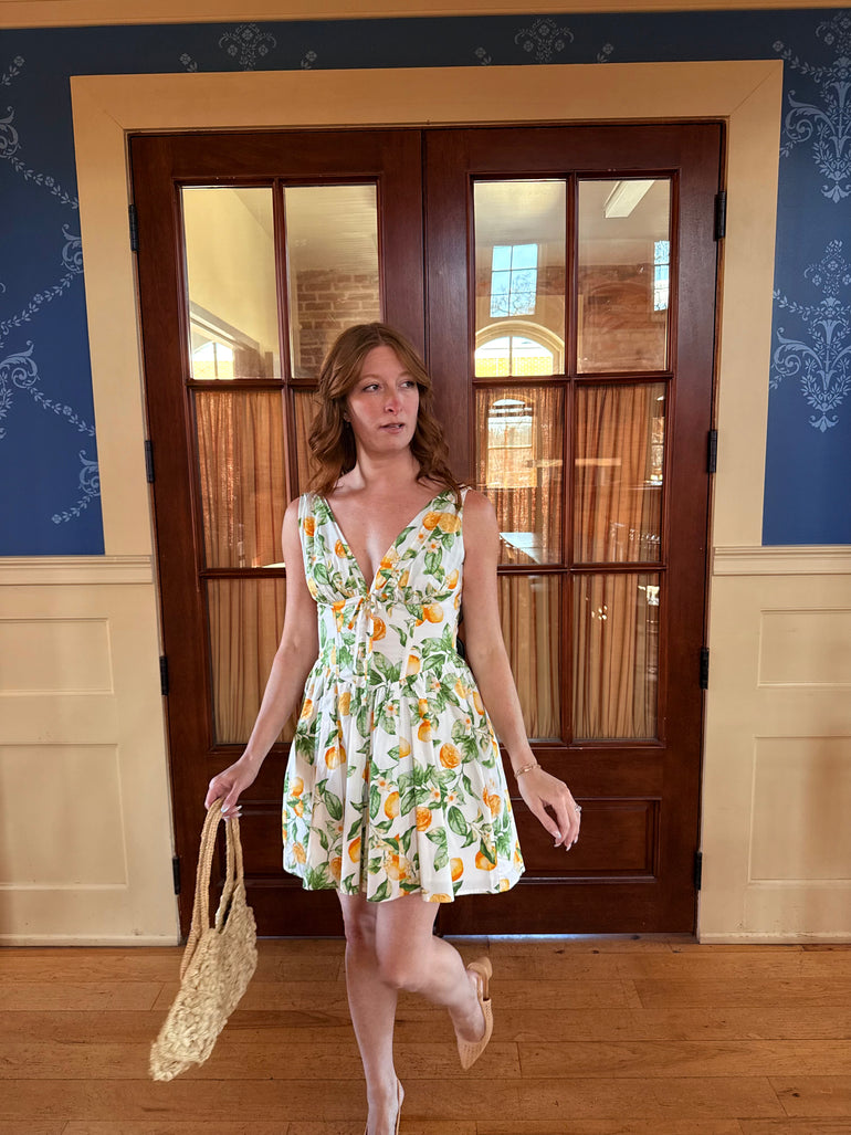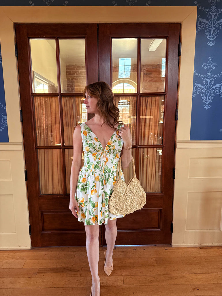 Lemon print mini dress with a corset inspired bodice. Model is 5'8" and wearing size Small. - Plunging neckline - Underbust detail - Center front bow - Corset bodice - Chevron waistline - Fit and flare - Smocked back panel with hidden zipper closure - Fully lined Shell: 100% Cotton Lining: 100% Cotton