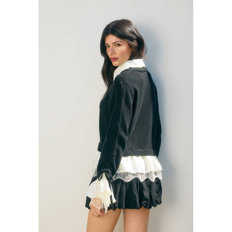 Partial satin blouse layer inside a relaxed fit sweater. - Collared - Lace trim - Basic fit - Ruching detail on the sleeves - Unlined Shell: 60% Cotton, 40% Acrylic Contrast: 100% Polyester Lining: None