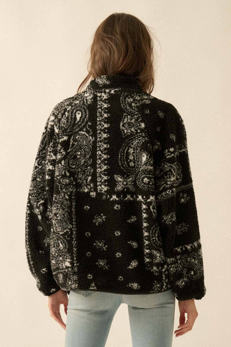 A paisley-print sherpa fleece jacket with the following features: