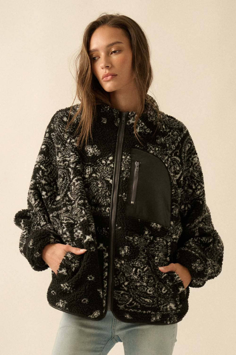 Paisley-Print Sherpa Fleece Zip-Up Pocket Jacket